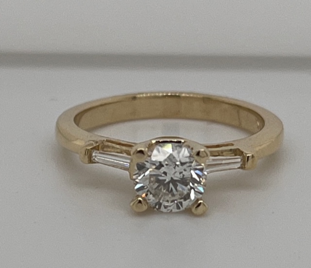 14k yellow gold 3-stone diamond ring. Center stone weighs approximately 3/4ct, I clarity, I-J color, with 2 side baguette diamonds. Complete piece weighs 3.1 grams. Size 6.25.