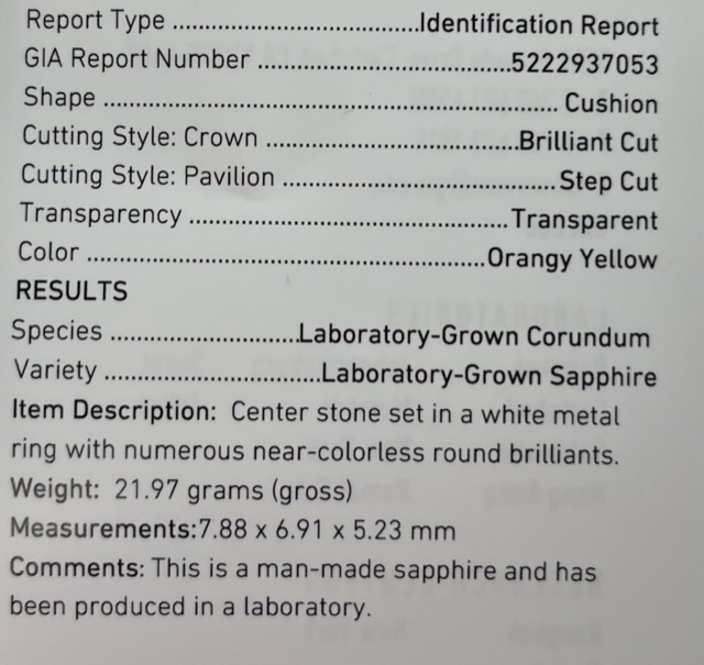 Platinum ring set with a lab created yellow sapphire, cushion cut, surrounded by 12 natural round brilliant diamonds. Sapphire has been graded by GIA, so a report comes with it. Diamonds appear to be SI clarity G/H Color, approximately 3/4ctw. Size 5.5. Piece weighs 21.97 grams.
