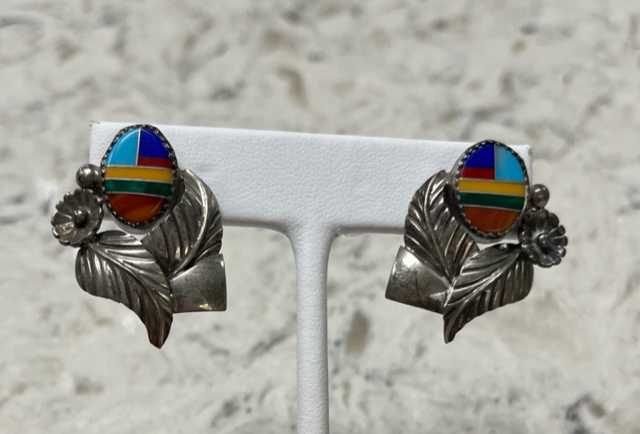 This Native American multi-stone inlay earring pair weighs 8.7grams. There is no hallmark. Stamped Sterling.